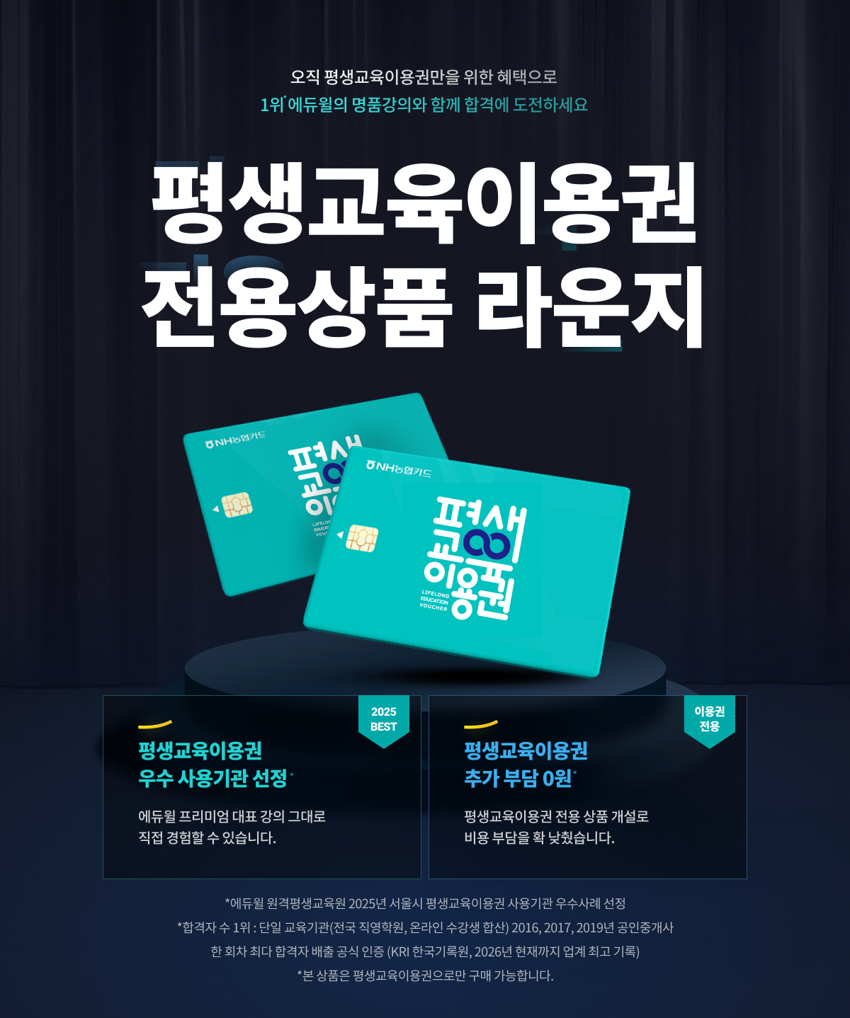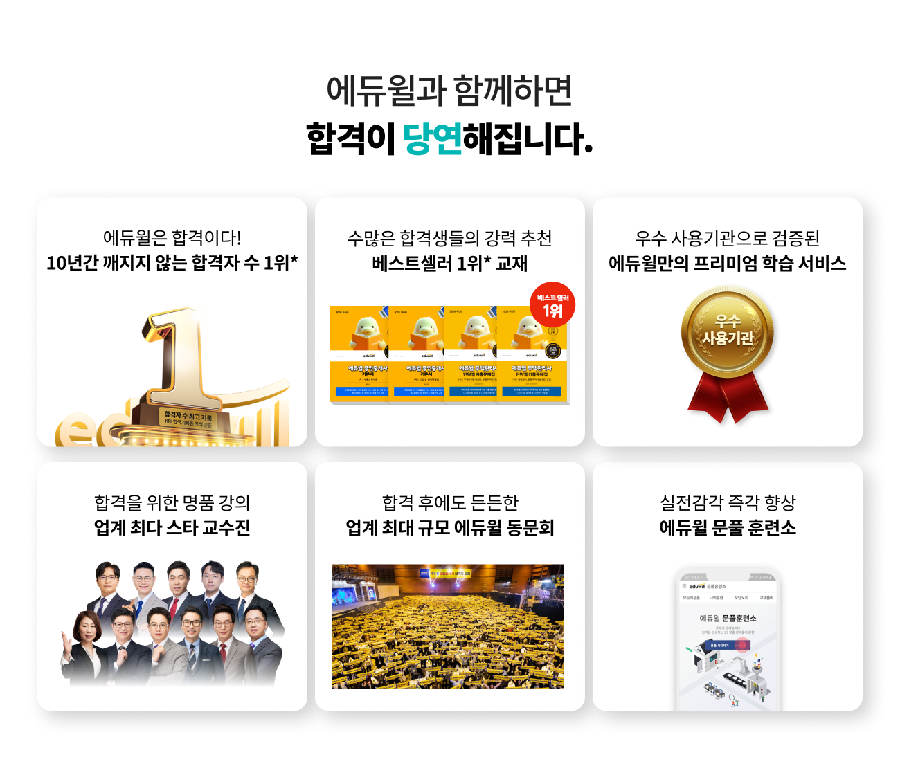 *합격자 수 1위 : 단일 교육기관(전국 직영학원, 온라인 수강생 합산) 2016, 2017, 2019년 공인중개사 한 회차 최다 합격자 배출 공식 인증 (KRI 한국기록원, 2026년 현재까지 업계 최고 기록) *16년간 베스트셀러 1위: YES24 공인중개사 베스트셀러 1위 2011년 12월, 2012년 1,12월, 2013년 1~5,8~12월, 2014년 1~5,7~8,12월, 2015년 2~4월, 2016년 2,4,6,12월, 2017년 1~12월, 2018년 1~12월, 2019년 1~12월, 2020년 1~12월, 2021년 1~12월, 2022년 1~12월, 2023년 1~7,9~10월,12월, 2024년 1~12월, 2025년 1~12월, 2026년 1~2월 월별 베스트 ※ 매 월별 1위는 교재별로 다름 *17년간 베스트셀러 1위: YES24 주택관리사 베스트셀러 1위 (2010년 12월, 2011년 3, 9, 12월, 2012년 1, 3~12월, 2013년 1~5, 8~11월, 2014년 2~8, 10~12월, 2015년 1~5, 7~12월, 2016년 1~12월, 2017년 1~12월, 2018년 1~12월, 2019년 1~12월, 2020년 1~7, 9~12월, 2021년 1~12월, 2022년 1~12월, 2023년 1~11월, 2024년 1~2, 4~12월, 2025년 1~12월, 2026년 1~2월 월별 베스트) ※ 매 월별 1위는 교재별로 다름 *에듀윌 원격평생교육원 2025년 서울시 평생교육이용권 사용기관 우수사례 선정